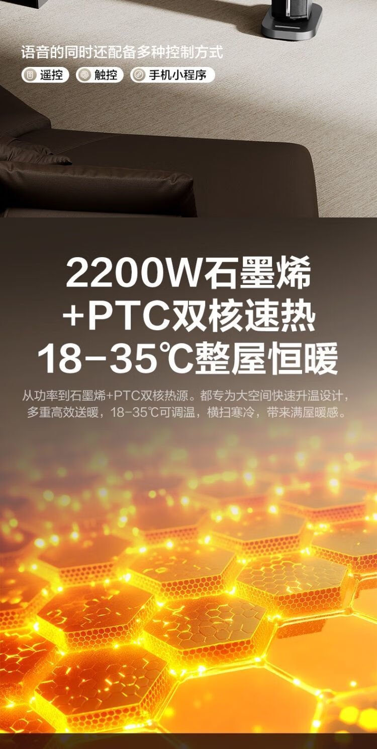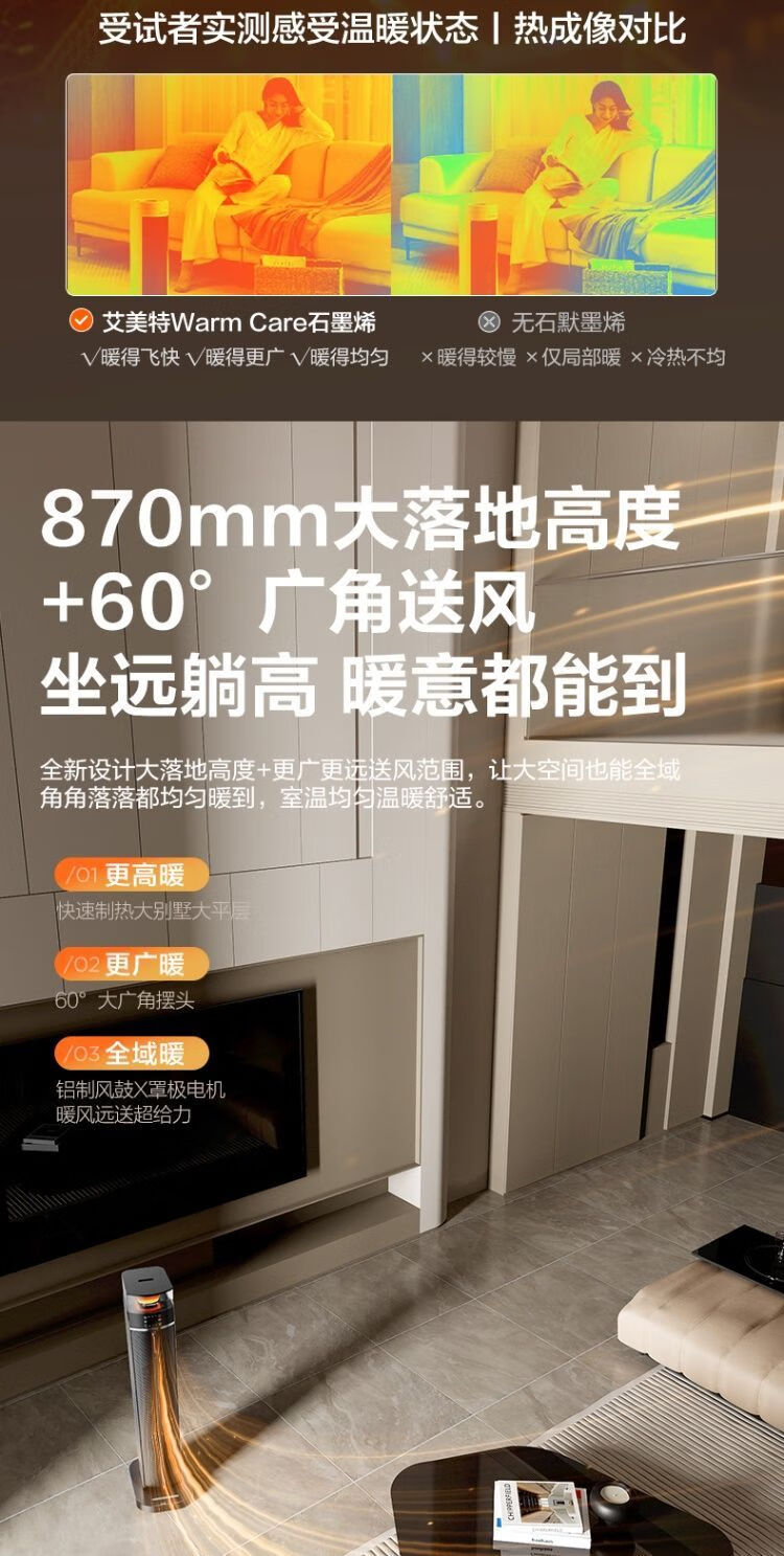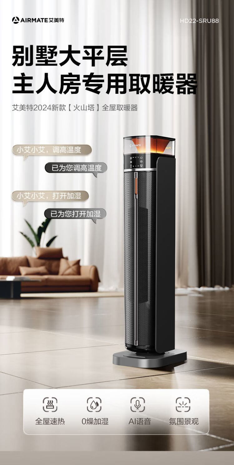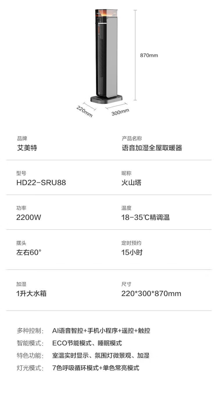 艾美特暖风机HP21-SRU88暖风机取暖器家用2200W 立式摇头暖气节能取暖器
