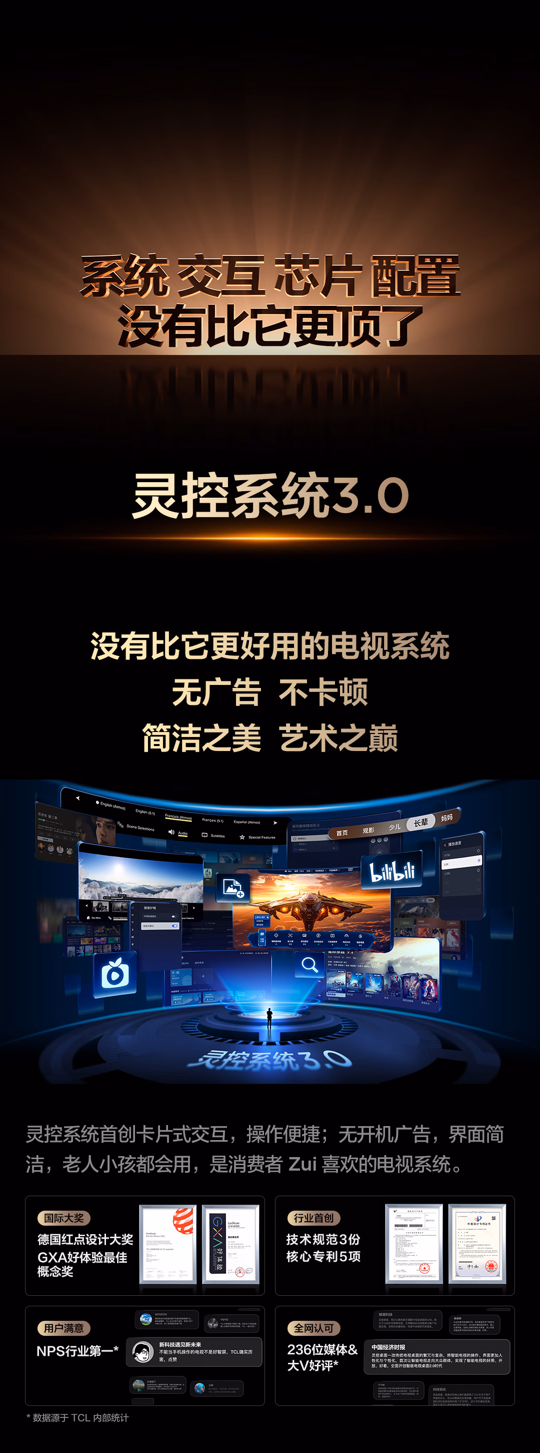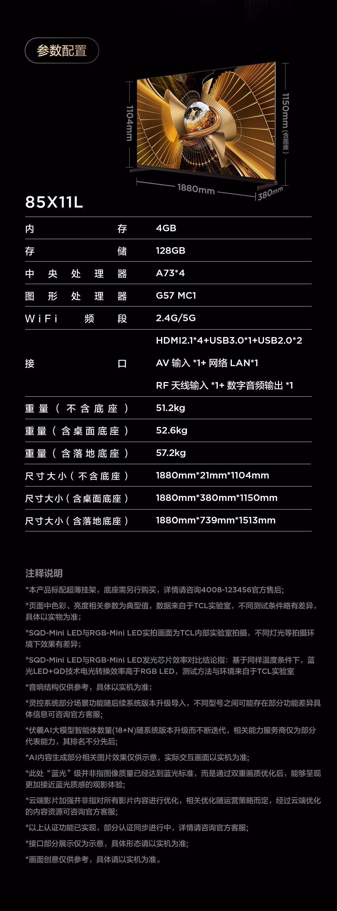- TCL电视 65A100L 65英寸 立体美学 浮窗全场景TV电视